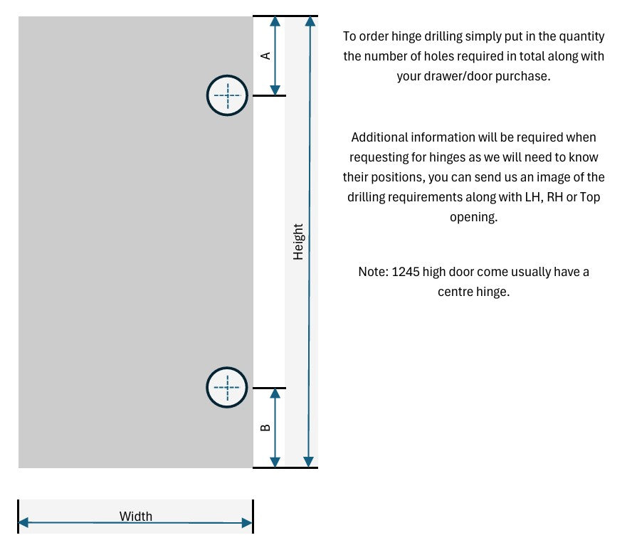 Hinge hole machining, select the number of holes you require and send us an email with the drilling centre measurements along with your order reference.